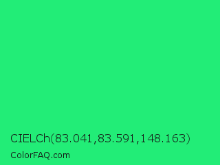 CIELCh 83.041,83.591,148.163 Color is a normal green color and the nearest color is Spring Green #00ff7f. Hex code #22ed77 and RGB value is rgb(34,237,119). In RGB color space, this color is composed of 13% red, 93% green, 47% blue, In CMYK color space, this color is composed of 86% cyan, 0% magenta, 50% yellow , 7% black , In HSL color space, this color has a hue angle of 145° , 85% saturation and 53% lightness.