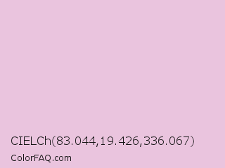 CIELCh 83.044,19.426,336.067 Color is a very light magenta color and the nearest color is Queen Pink #e8ccd7. Hex code #eac4de and RGB value is rgb(234,196,222). In RGB color space, this color is composed of 92% red, 77% green, 87% blue, In CMYK color space, this color is composed of 0% cyan, 16% magenta, 5% yellow , 8% black , In HSL color space, this color has a hue angle of 319° , 48% saturation and 84% lightness.