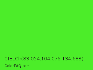 CIELCh 83.054,104.076,134.688 Color is a normal green color and the nearest color is Neon Green #39ff14. Hex code #4ced29 and RGB value is rgb(76,237,41). In RGB color space, this color is composed of 30% red, 93% green, 16% blue, In CMYK color space, this color is composed of 68% cyan, 0% magenta, 83% yellow , 7% black , In HSL color space, this color has a hue angle of 109° , 84% saturation and 55% lightness.