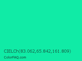 CIELCh 83.062,65.842,161.809 Color is a normal green color and the nearest color is Medium Spring Green #00fa9a. Hex code #10eba6 and RGB value is rgb(16,235,166). In RGB color space, this color is composed of 6% red, 92% green, 65% blue, In CMYK color space, this color is composed of 93% cyan, 0% magenta, 29% yellow , 8% black , In HSL color space, this color has a hue angle of 161° , 87% saturation and 49% lightness.
