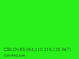 CIELCh 83.064,110.219,135.967 Color is a normal green color and the nearest color is Neon Green #39ff14. Hex code #29ef1b and RGB value is rgb(41,239,27). In RGB color space, this color is composed of 16% red, 94% green, 11% blue, In CMYK color space, this color is composed of 83% cyan, 0% magenta, 89% yellow , 6% black , In HSL color space, this color has a hue angle of 116° , 87% saturation and 52% lightness.