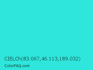 CIELCh 83.067,46.113,189.032 Color is a normal cyan color and the nearest color is Turquoise #40e0d0. Hex code #2ee6db and RGB value is rgb(46,230,219). In RGB color space, this color is composed of 18% red, 90% green, 86% blue, In CMYK color space, this color is composed of 80% cyan, 0% magenta, 5% yellow , 10% black , In HSL color space, this color has a hue angle of 176° , 79% saturation and 54% lightness.
