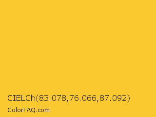 CIELCh 83.078,76.066,87.092 Color is a normal orange color and the nearest color is Sunglow #ffcc33. Hex code #fac930 and RGB value is rgb(250,201,48). In RGB color space, this color is composed of 98% red, 79% green, 19% blue, In CMYK color space, this color is composed of 0% cyan, 20% magenta, 81% yellow , 2% black , In HSL color space, this color has a hue angle of 45° , 95% saturation and 58% lightness.