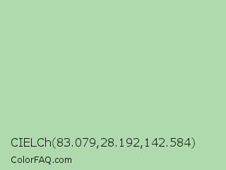 CIELCh 83.079,28.192,142.584 Color is a light green color and the nearest color is Moss Green #addfad. Hex code #afdaae and RGB value is rgb(175,218,174). In RGB color space, this color is composed of 69% red, 85% green, 68% blue, In CMYK color space, this color is composed of 20% cyan, 0% magenta, 20% yellow , 15% black , In HSL color space, this color has a hue angle of 119° , 37% saturation and 77% lightness.