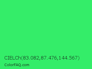 CIELCh 83.082,87.476,144.567 Color is a normal green color and the nearest color is UFO Green #3cd070. Hex code #34ed69 and RGB value is rgb(52,237,105). In RGB color space, this color is composed of 20% red, 93% green, 41% blue, In CMYK color space, this color is composed of 78% cyan, 0% magenta, 56% yellow , 7% black , In HSL color space, this color has a hue angle of 137° , 84% saturation and 57% lightness.