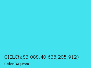 CIELCh 83.088,40.638,205.912 Color is a normal cyan color and the nearest color is Turquoise #40e0d0. Hex code #42e3ef and RGB value is rgb(66,227,239). In RGB color space, this color is composed of 26% red, 89% green, 94% blue, In CMYK color space, this color is composed of 72% cyan, 5% magenta, 0% yellow , 6% black , In HSL color space, this color has a hue angle of 184° , 84% saturation and 60% lightness.