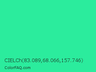 CIELCh 83.089,68.066,157.746 Color is a normal green color and the nearest color is Shamrock #33cc99. Hex code #2beb9c and RGB value is rgb(43,235,156). In RGB color space, this color is composed of 17% red, 92% green, 61% blue, In CMYK color space, this color is composed of 82% cyan, 0% magenta, 34% yellow , 8% black , In HSL color space, this color has a hue angle of 155° , 83% saturation and 55% lightness.