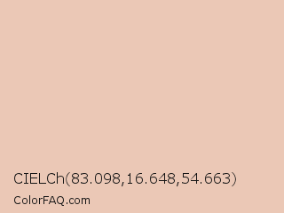 CIELCh 83.098,16.648,54.663 Color is a very light orange color and the nearest color is Just Right #eccdb9. Hex code #ebc8b6 and RGB value is rgb(235,200,182). In RGB color space, this color is composed of 92% red, 78% green, 71% blue, In CMYK color space, this color is composed of 0% cyan, 15% magenta, 23% yellow , 8% black , In HSL color space, this color has a hue angle of 20° , 57% saturation and 82% lightness.