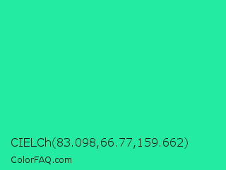 CIELCh 83.098,66.77,159.662 Color is a normal green color and the nearest color is Shamrock #33cc99. Hex code #23eba1 and RGB value is rgb(35,235,161). In RGB color space, this color is composed of 14% red, 92% green, 63% blue, In CMYK color space, this color is composed of 85% cyan, 0% magenta, 31% yellow , 8% black , In HSL color space, this color has a hue angle of 158° , 83% saturation and 53% lightness.