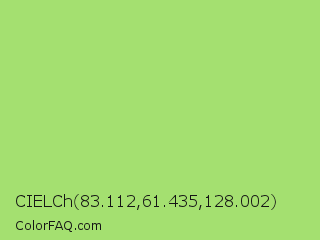 CIELCh 83.112,61.435,128.002 Color is a light green color and the nearest color is Inchworm #b2ec5d. Hex code #a4e070 and RGB value is rgb(164,224,112). In RGB color space, this color is composed of 64% red, 88% green, 44% blue, In CMYK color space, this color is composed of 27% cyan, 0% magenta, 50% yellow , 12% black , In HSL color space, this color has a hue angle of 92° , 64% saturation and 66% lightness.