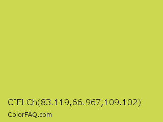CIELCh 83.119,66.967,109.102 Color is a normal yellow color and the nearest color is June Bud #bdda57. Hex code #cbd850 and RGB value is rgb(203,216,80). In RGB color space, this color is composed of 80% red, 85% green, 31% blue, In CMYK color space, this color is composed of 6% cyan, 0% magenta, 63% yellow , 15% black , In HSL color space, this color has a hue angle of 66° , 64% saturation and 58% lightness.