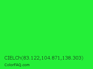 CIELCh 83.122,104.871,138.303 Color is a normal green color and the nearest color is Lime Green #32cd32. Hex code #24ef38 and RGB value is rgb(36,239,56). In RGB color space, this color is composed of 14% red, 94% green, 22% blue, In CMYK color space, this color is composed of 85% cyan, 0% magenta, 77% yellow , 6% black , In HSL color space, this color has a hue angle of 126° , 86% saturation and 54% lightness.