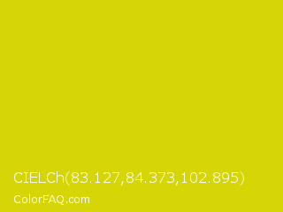 CIELCh 83.127,84.373,102.895 Color is a normal yellow color and the nearest color is Citrine #e4d00a. Hex code #d6d606 and RGB value is rgb(214,214,6). In RGB color space, this color is composed of 84% red, 84% green, 2% blue, In CMYK color space, this color is composed of 0% cyan, 0% magenta, 97% yellow , 16% black , In HSL color space, this color has a hue angle of 60° , 95% saturation and 43% lightness.