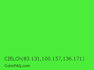 CIELCh 83.131,100.157,136.171 Color is a normal green color and the nearest color is Lime Green #32cd32. Hex code #4ced3a and RGB value is rgb(76,237,58). In RGB color space, this color is composed of 30% red, 93% green, 23% blue, In CMYK color space, this color is composed of 68% cyan, 0% magenta, 76% yellow , 7% black , In HSL color space, this color has a hue angle of 114° , 83% saturation and 58% lightness.