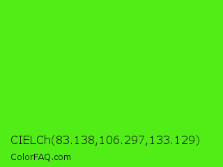 CIELCh 83.138,106.297,133.129 Color is a normal green color and the nearest color is Chlorophyll Green #4aff00. Hex code #52ed17 and RGB value is rgb(82,237,23). In RGB color space, this color is composed of 32% red, 93% green, 9% blue, In CMYK color space, this color is composed of 65% cyan, 0% magenta, 90% yellow , 7% black , In HSL color space, this color has a hue angle of 103° , 86% saturation and 51% lightness.