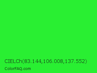 CIELCh 83.144,106.008,137.552 Color is a normal green color and the nearest color is Lime Green #32cd32. Hex code #29ef32 and RGB value is rgb(41,239,50). In RGB color space, this color is composed of 16% red, 94% green, 20% blue, In CMYK color space, this color is composed of 83% cyan, 0% magenta, 79% yellow , 6% black , In HSL color space, this color has a hue angle of 123° , 86% saturation and 55% lightness.