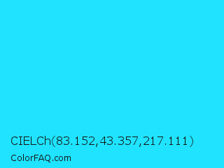 CIELCh 83.152,43.357,217.111 Color is a normal cyan color and the nearest color is Loeen #15f2fd. Hex code #1fe3ff and RGB value is rgb(31,227,255). In RGB color space, this color is composed of 12% red, 89% green, 100% blue, In CMYK color space, this color is composed of 88% cyan, 11% magenta, 0% yellow , 0% black , In HSL color space, this color has a hue angle of 188° , 100% saturation and 56% lightness.