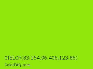 CIELCh 83.154,96.406,123.86 Color is a normal green color and the nearest color is Alien Armpit #84de02. Hex code #8fe609 and RGB value is rgb(143,230,9). In RGB color space, this color is composed of 56% red, 90% green, 4% blue, In CMYK color space, this color is composed of 38% cyan, 0% magenta, 96% yellow , 10% black , In HSL color space, this color has a hue angle of 84° , 92% saturation and 47% lightness.