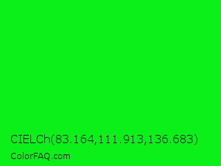 CIELCh 83.164,111.913,136.683 Color is a normal green color and the nearest color is Green #00ff00. Hex code #0cf01a and RGB value is rgb(12,240,26). In RGB color space, this color is composed of 5% red, 94% green, 10% blue, In CMYK color space, this color is composed of 95% cyan, 0% magenta, 89% yellow , 6% black , In HSL color space, this color has a hue angle of 124° , 90% saturation and 49% lightness.