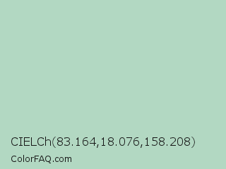 CIELCh 83.164,18.076,158.208 Color is a light green color and the nearest color is Gum Leaf #b6d3bf. Hex code #b2d8c2 and RGB value is rgb(178,216,194). In RGB color space, this color is composed of 70% red, 85% green, 76% blue, In CMYK color space, this color is composed of 18% cyan, 0% magenta, 10% yellow , 15% black , In HSL color space, this color has a hue angle of 145° , 33% saturation and 77% lightness.