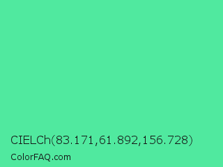 CIELCh 83.171,61.892,156.728 Color is a light green color and the nearest color is Eucalyptus #44d7a8. Hex code #50e99f and RGB value is rgb(80,233,159). In RGB color space, this color is composed of 31% red, 91% green, 62% blue, In CMYK color space, this color is composed of 66% cyan, 0% magenta, 32% yellow , 9% black , In HSL color space, this color has a hue angle of 151° , 78% saturation and 61% lightness.