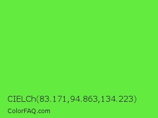 CIELCh 83.171,94.863,134.223 Color is a normal green color and the nearest color is Kiwi #8ee53f. Hex code #64eb3f and RGB value is rgb(100,235,63). In RGB color space, this color is composed of 39% red, 92% green, 25% blue, In CMYK color space, this color is composed of 57% cyan, 0% magenta, 73% yellow , 8% black , In HSL color space, this color has a hue angle of 107° , 81% saturation and 58% lightness.