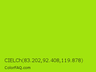 CIELCh 83.202,92.408,119.878 Color is a normal lime color and the nearest color is Vivid Lime Green #a6d608. Hex code #a1e30d and RGB value is rgb(161,227,13). In RGB color space, this color is composed of 63% red, 89% green, 5% blue, In CMYK color space, this color is composed of 29% cyan, 0% magenta, 94% yellow , 11% black , In HSL color space, this color has a hue angle of 79° , 89% saturation and 47% lightness.