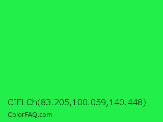 CIELCh 83.205,100.059,140.448 Color is a normal green color and the nearest color is Malachite #0bda51. Hex code #21ef4a and RGB value is rgb(33,239,74). In RGB color space, this color is composed of 13% red, 94% green, 29% blue, In CMYK color space, this color is composed of 86% cyan, 0% magenta, 69% yellow , 6% black , In HSL color space, this color has a hue angle of 132° , 87% saturation and 53% lightness.