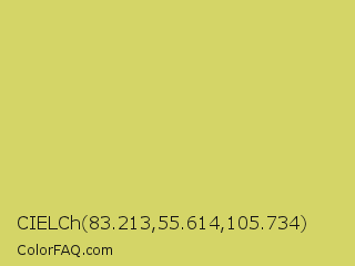 CIELCh 83.213,55.614,105.734 Color is a light yellow color and the nearest color is Chenin #dfcd6f. Hex code #d4d567 and RGB value is rgb(212,213,103). In RGB color space, this color is composed of 83% red, 84% green, 40% blue, In CMYK color space, this color is composed of 0% cyan, 0% magenta, 52% yellow , 16% black , In HSL color space, this color has a hue angle of 61° , 57% saturation and 62% lightness.