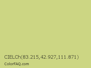 CIELCh 83.215,42.927,111.871 Color is a light yellow color and the nearest color is Medium Spring Bud #c9dc87. Hex code #ccd683 and RGB value is rgb(204,214,131). In RGB color space, this color is composed of 80% red, 84% green, 51% blue, In CMYK color space, this color is composed of 5% cyan, 0% magenta, 39% yellow , 16% black , In HSL color space, this color has a hue angle of 67° , 50% saturation and 68% lightness.