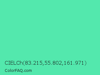 CIELCh 83.215,55.802,161.971 Color is a light green color and the nearest color is Medium Aquamarine #66ddaa. Hex code #53e8ad and RGB value is rgb(83,232,173). In RGB color space, this color is composed of 33% red, 91% green, 68% blue, In CMYK color space, this color is composed of 64% cyan, 0% magenta, 25% yellow , 9% black , In HSL color space, this color has a hue angle of 156° , 76% saturation and 62% lightness.