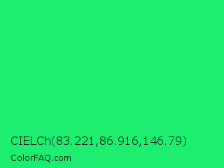 CIELCh 83.221,86.916,146.79 Color is a normal green color and the nearest color is Spring Green #00ff7f. Hex code #1dee70 and RGB value is rgb(29,238,112). In RGB color space, this color is composed of 11% red, 93% green, 44% blue, In CMYK color space, this color is composed of 88% cyan, 0% magenta, 53% yellow , 7% black , In HSL color space, this color has a hue angle of 144° , 86% saturation and 52% lightness.