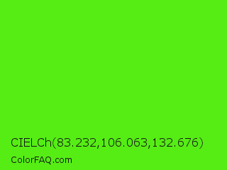 CIELCh 83.232,106.063,132.676 Color is a normal green color and the nearest color is Chlorophyll Green #4aff00. Hex code #56ed15 and RGB value is rgb(86,237,21). In RGB color space, this color is composed of 34% red, 93% green, 8% blue, In CMYK color space, this color is composed of 64% cyan, 0% magenta, 91% yellow , 7% black , In HSL color space, this color has a hue angle of 102° , 86% saturation and 51% lightness.