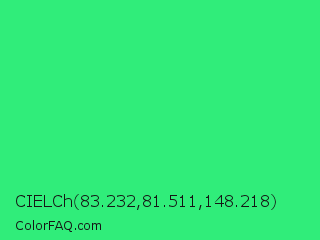 CIELCh 83.232,81.511,148.218 Color is a normal green color and the nearest color is UFO Green #3cd070. Hex code #30ed7a and RGB value is rgb(48,237,122). In RGB color space, this color is composed of 19% red, 93% green, 48% blue, In CMYK color space, this color is composed of 80% cyan, 0% magenta, 49% yellow , 7% black , In HSL color space, this color has a hue angle of 143° , 84% saturation and 56% lightness.