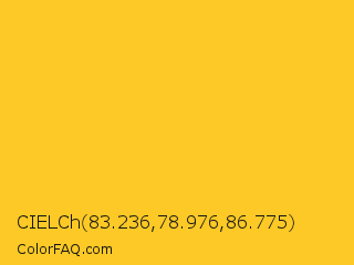 CIELCh 83.236,78.976,86.775 Color is a normal yellow color and the nearest color is Lightning Yellow #fcc01e. Hex code #fcc926 and RGB value is rgb(252,201,38). In RGB color space, this color is composed of 99% red, 79% green, 15% blue, In CMYK color space, this color is composed of 0% cyan, 20% magenta, 85% yellow , 1% black , In HSL color space, this color has a hue angle of 46° , 97% saturation and 57% lightness.
