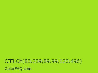 CIELCh 83.239,89.99,120.496 Color is a normal green color and the nearest color is Inch Worm #b0e313. Hex code #a1e31f and RGB value is rgb(161,227,31). In RGB color space, this color is composed of 63% red, 89% green, 12% blue, In CMYK color space, this color is composed of 29% cyan, 0% magenta, 86% yellow , 11% black , In HSL color space, this color has a hue angle of 80° , 78% saturation and 51% lightness.