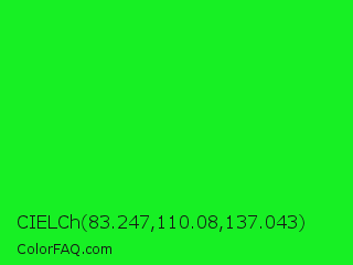 CIELCh 83.247,110.08,137.043 Color is a normal green color and the nearest color is Neon Green #39ff14. Hex code #17f024 and RGB value is rgb(23,240,36). In RGB color space, this color is composed of 9% red, 94% green, 14% blue, In CMYK color space, this color is composed of 90% cyan, 0% magenta, 85% yellow , 6% black , In HSL color space, this color has a hue angle of 124° , 88% saturation and 52% lightness.