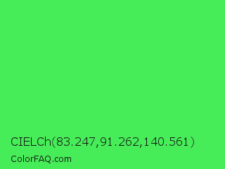 CIELCh 83.247,91.262,140.561 Color is a normal green color and the nearest color is Screamin Green #66ff66. Hex code #47ed59 and RGB value is rgb(71,237,89). In RGB color space, this color is composed of 28% red, 93% green, 35% blue, In CMYK color space, this color is composed of 70% cyan, 0% magenta, 62% yellow , 7% black , In HSL color space, this color has a hue angle of 127° , 82% saturation and 60% lightness.