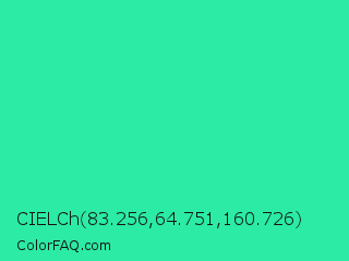 CIELCh 83.256,64.751,160.726 Color is a normal green color and the nearest color is Eucalyptus #44d7a8. Hex code #2beba5 and RGB value is rgb(43,235,165). In RGB color space, this color is composed of 17% red, 92% green, 65% blue, In CMYK color space, this color is composed of 82% cyan, 0% magenta, 30% yellow , 8% black , In HSL color space, this color has a hue angle of 158° , 83% saturation and 55% lightness.