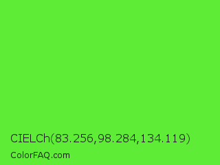 CIELCh 83.256,98.284,134.119 Color is a normal green color and the nearest color is Spring Frost #87ff2a. Hex code #5eec37 and RGB value is rgb(94,236,55). In RGB color space, this color is composed of 37% red, 93% green, 22% blue, In CMYK color space, this color is composed of 60% cyan, 0% magenta, 77% yellow , 7% black , In HSL color space, this color has a hue angle of 107° , 83% saturation and 57% lightness.