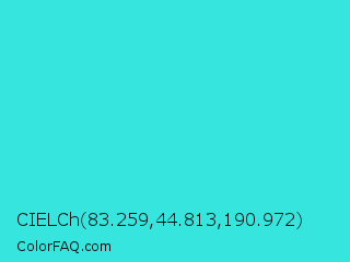CIELCh 83.259,44.813,190.972 Color is a normal cyan color and the nearest color is Turquoise #40e0d0. Hex code #36e6de and RGB value is rgb(54,230,222). In RGB color space, this color is composed of 21% red, 90% green, 87% blue, In CMYK color space, this color is composed of 77% cyan, 0% magenta, 3% yellow , 10% black , In HSL color space, this color has a hue angle of 177° , 78% saturation and 56% lightness.