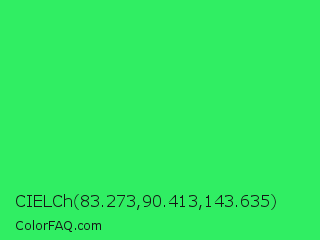 CIELCh 83.273,90.413,143.635 Color is a normal green color and the nearest color is UFO Green #3cd070. Hex code #30ee63 and RGB value is rgb(48,238,99). In RGB color space, this color is composed of 19% red, 93% green, 39% blue, In CMYK color space, this color is composed of 80% cyan, 0% magenta, 58% yellow , 7% black , In HSL color space, this color has a hue angle of 136° , 85% saturation and 56% lightness.
