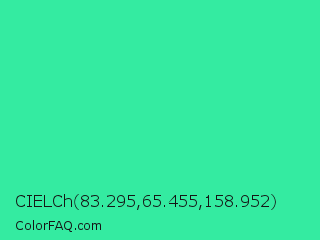 CIELCh 83.295,65.455,158.952 Color is a normal green color and the nearest color is Eucalyptus #44d7a8. Hex code #34eba1 and RGB value is rgb(52,235,161). In RGB color space, this color is composed of 20% red, 92% green, 63% blue, In CMYK color space, this color is composed of 78% cyan, 0% magenta, 31% yellow , 8% black , In HSL color space, this color has a hue angle of 156° , 82% saturation and 56% lightness.