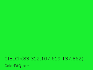 CIELCh 83.312,107.619,137.862 Color is a normal green color and the nearest color is Malachite #0bda51. Hex code #1af030 and RGB value is rgb(26,240,48). In RGB color space, this color is composed of 10% red, 94% green, 19% blue, In CMYK color space, this color is composed of 89% cyan, 0% magenta, 80% yellow , 6% black , In HSL color space, this color has a hue angle of 126° , 88% saturation and 52% lightness.