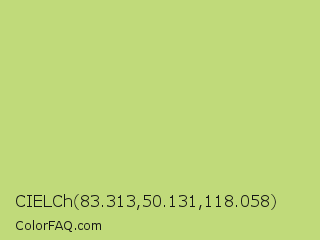 CIELCh 83.313,50.131,118.058 Color is a light lime color and the nearest color is Yellow Green #c5e17a. Hex code #c0da7a and RGB value is rgb(192,218,122). In RGB color space, this color is composed of 75% red, 85% green, 48% blue, In CMYK color space, this color is composed of 12% cyan, 0% magenta, 44% yellow , 15% black , In HSL color space, this color has a hue angle of 76° , 56% saturation and 67% lightness.