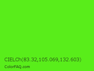 CIELCh 83.32,105.069,132.603 Color is a normal green color and the nearest color is Bright Green #66ff00. Hex code #59ed1a and RGB value is rgb(89,237,26). In RGB color space, this color is composed of 35% red, 93% green, 10% blue, In CMYK color space, this color is composed of 62% cyan, 0% magenta, 89% yellow , 7% black , In HSL color space, this color has a hue angle of 102° , 85% saturation and 52% lightness.