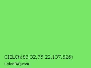 CIELCh 83.32,75.22,137.826 Color is a light green color and the nearest color is Pastel Green #77dd77. Hex code #78e86b and RGB value is rgb(120,232,107). In RGB color space, this color is composed of 47% red, 91% green, 42% blue, In CMYK color space, this color is composed of 48% cyan, 0% magenta, 54% yellow , 9% black , In HSL color space, this color has a hue angle of 114° , 73% saturation and 66% lightness.