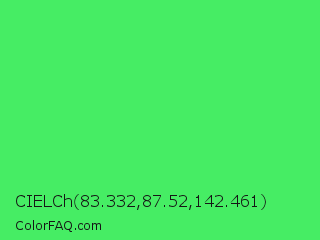 CIELCh 83.332,87.52,142.461 Color is a normal green color and the nearest color is UFO Green #3cd070. Hex code #46ed64 and RGB value is rgb(70,237,100). In RGB color space, this color is composed of 27% red, 93% green, 39% blue, In CMYK color space, this color is composed of 70% cyan, 0% magenta, 58% yellow , 7% black , In HSL color space, this color has a hue angle of 131° , 82% saturation and 60% lightness.