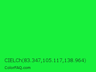 CIELCh 83.347,105.117,138.964 Color is a normal green color and the nearest color is Malachite #0bda51. Hex code #17f03b and RGB value is rgb(23,240,59). In RGB color space, this color is composed of 9% red, 94% green, 23% blue, In CMYK color space, this color is composed of 90% cyan, 0% magenta, 75% yellow , 6% black , In HSL color space, this color has a hue angle of 130° , 88% saturation and 52% lightness.
