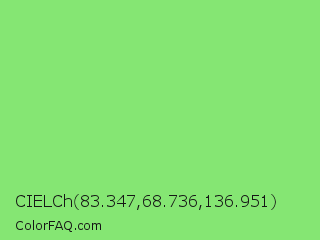 CIELCh 83.347,68.736,136.951 Color is a light green color and the nearest color is Pastel Green #77dd77. Hex code #85e673 and RGB value is rgb(133,230,115). In RGB color space, this color is composed of 52% red, 90% green, 45% blue, In CMYK color space, this color is composed of 42% cyan, 0% magenta, 50% yellow , 10% black , In HSL color space, this color has a hue angle of 111° , 70% saturation and 68% lightness.